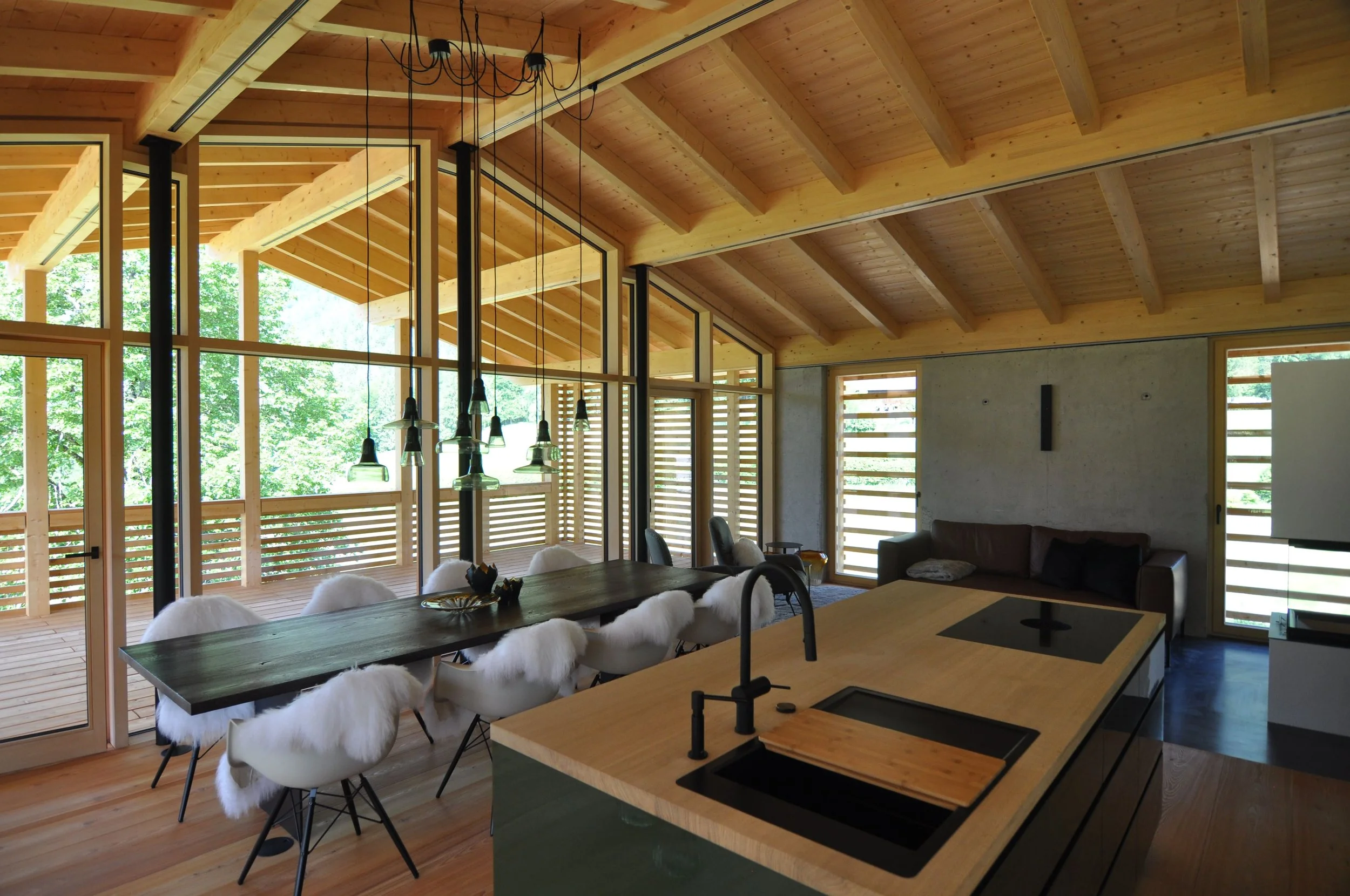In herausragender Lage oberhalb des Hintersees ist ein kleines Seminarhaus für firmeneigene Schulungen entstanden. Es nimmt Elemente des unsprünglich an der Stelle gestandenen landwirtschaftlichen Stadels auf und vervollständigt das bestehende Landhausensemble. Eine große Fensterfront und ein großer überdachter Balkon ermöglicht grandiose Blicke auf die umgebende Landschaft.